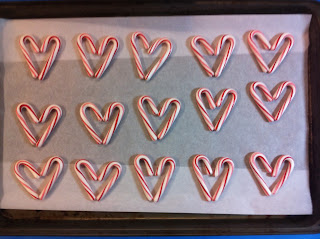 Set the oven to 300F degrees. Line the cookie sheet with parchment paper. Remove the wrappers from the candy canes. Place the candy canes on the cookie sheet in heart shapes. Bake for THREE minutes. Remove from oven, pinch the ends together to solidify the joints, let cool. Place on top of the WARM cookies, let cool. Enjoy!