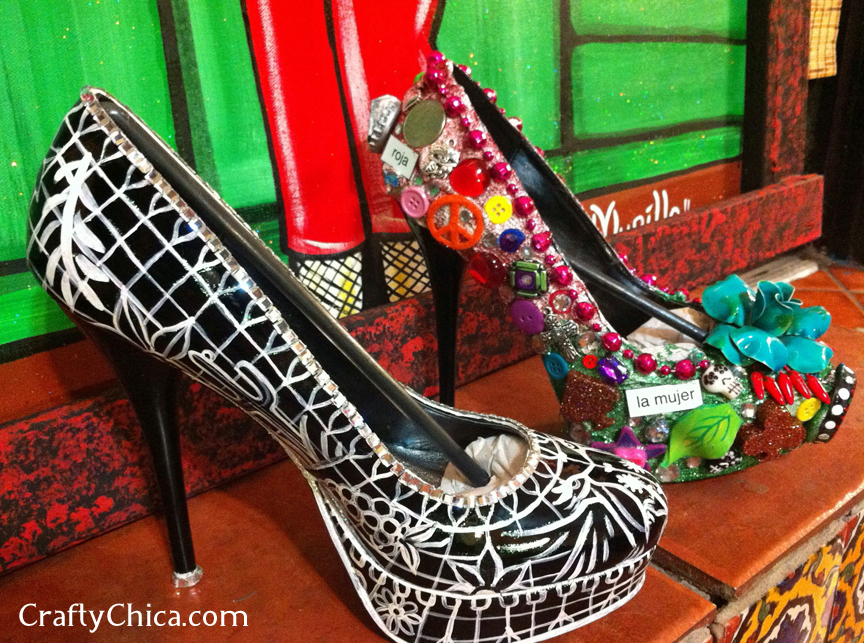 Patrick and I always get asked to make art pieces for local fundraisers and this was one of our favorites! We were each given a black stiletto. Patrick’s is on the left. He used only white and painted a papel picado design. I went a bit loca and did a decoden technique using all kinds of knickknacks from around my studio.