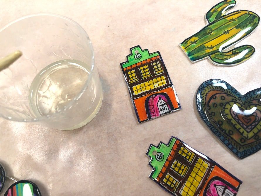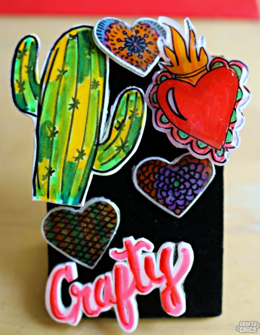 Cut a sheet of the shrink plastic in quarters, this is you want pieces that will end up about 2-1/2″ in size. Cut your shapes and use the black pen to draw your outlines, then fill in with colored pencil or marker.