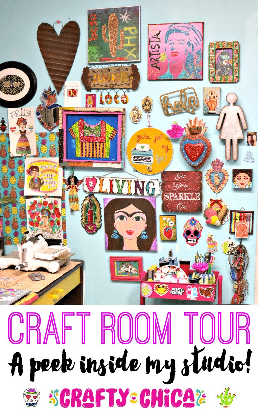 Branded packing tape. I love this stuff. I use it on my outgoing packages because I feel like it adds a lot of personality!I glittered my bulletin boards! Here is the tutorial. This is a puffy heart made by my friend Anita from The Phoenix Fridas.I like to find random place for random things. Every spot is filled with inspiration!This is my gallery wall behind where I sit. The goal is to do more YouTube videos!I have my books on display to remind myself to keep writing. and to remind myself of big accomplishments (for those days when I’m feeling uninspired).I’m constantly drawing and painting. Practice makes progress. I use this space to hang up recent pieces.Mugs fresh out of the kiln!I paint mugs almost every night to keep up with the demand. And I set these on top of a TV tray that Patrick painted and resined.This is a wonderful piece someone made for me, but I lost the card and forgot to sent it! If you are out there and reading this, thank you again! I LOVE IT and look at it every day!My husband brought me silk flowers from the dollar store. Just like our love – they will never die!I bought these from Target’s Dollar Spot months ago. I plan to transform them into alebrijes!Packing up merchandise to take to Mucho Mas Art Studio!I do a lot of illustration work! I like to take random drawings and make stickers out them to sell!Gearing up to sew like crazy!This is a catch-all corner. it’s good to keep things close by that you use every day!All my ceramic underglazes! I think I need a bigger storage area for these!Works in progress. Small paintings in the works!This is a little catch-all trinket tray for everyday objects. Lipbalm, metallic stars, etc.This tray is new! I painted it using my friend Sara’s silkscreen. It’s fired. I’m going to keep it on my worktable for objects I’m using for my current project.This is a piece from one of my Crafty ChicaSizzix dies. I just received the prototypes and was testing them out. This came out sooo cute!Always gotta have gems and sequins on deck! In case of emergency!Book in progress. I have three trays to use for supplies!Another gallery wall!Inside the cabinets! Um, it is semi-organized!I try to keep all things fabric in this area.A special box for my favorite glitter stash!All my favorite brushes and pens go here.My beloved Sizzix Big Shot is the star of this table!I bought a bunch of gold signs on clearance at Target. I gave them Crafty Chica makeovers!