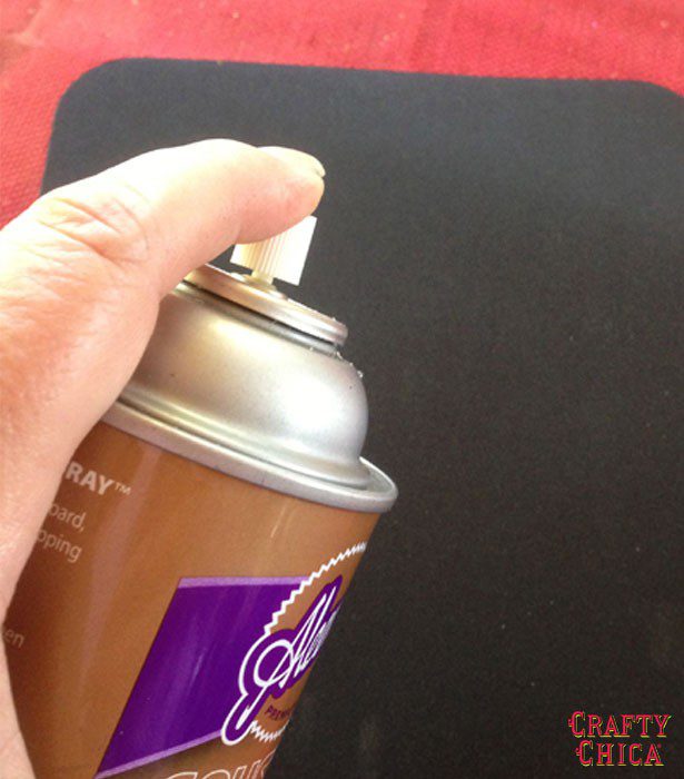 Generously spray your mouse pad (especially the edges!) with the adhesive. Let it set for a minute until the wet areas turn solid. This is so that when you place your fabric on, the wet area won’t seep through.