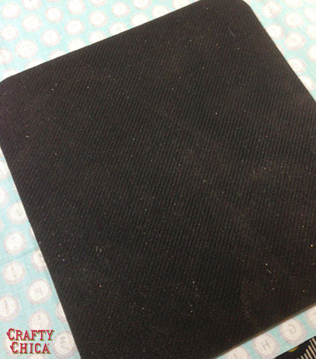 Set out your fabric on a smooth surface, the ironing board works perfectly. It needs to have a bit of cushion. Place your sprayed mouse pad on the backside of the fabric and press in place. Give it a good rub with your hands.