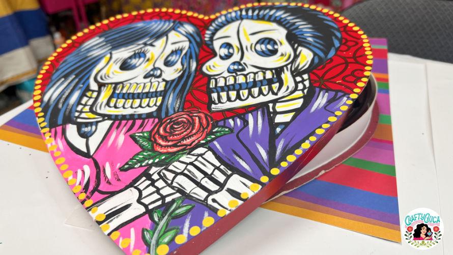 Here is a free muertos Valentine coloring page! Last week my husband, Patrick, painted the top of a chocolate box and he has been filling custom orders like crazy.