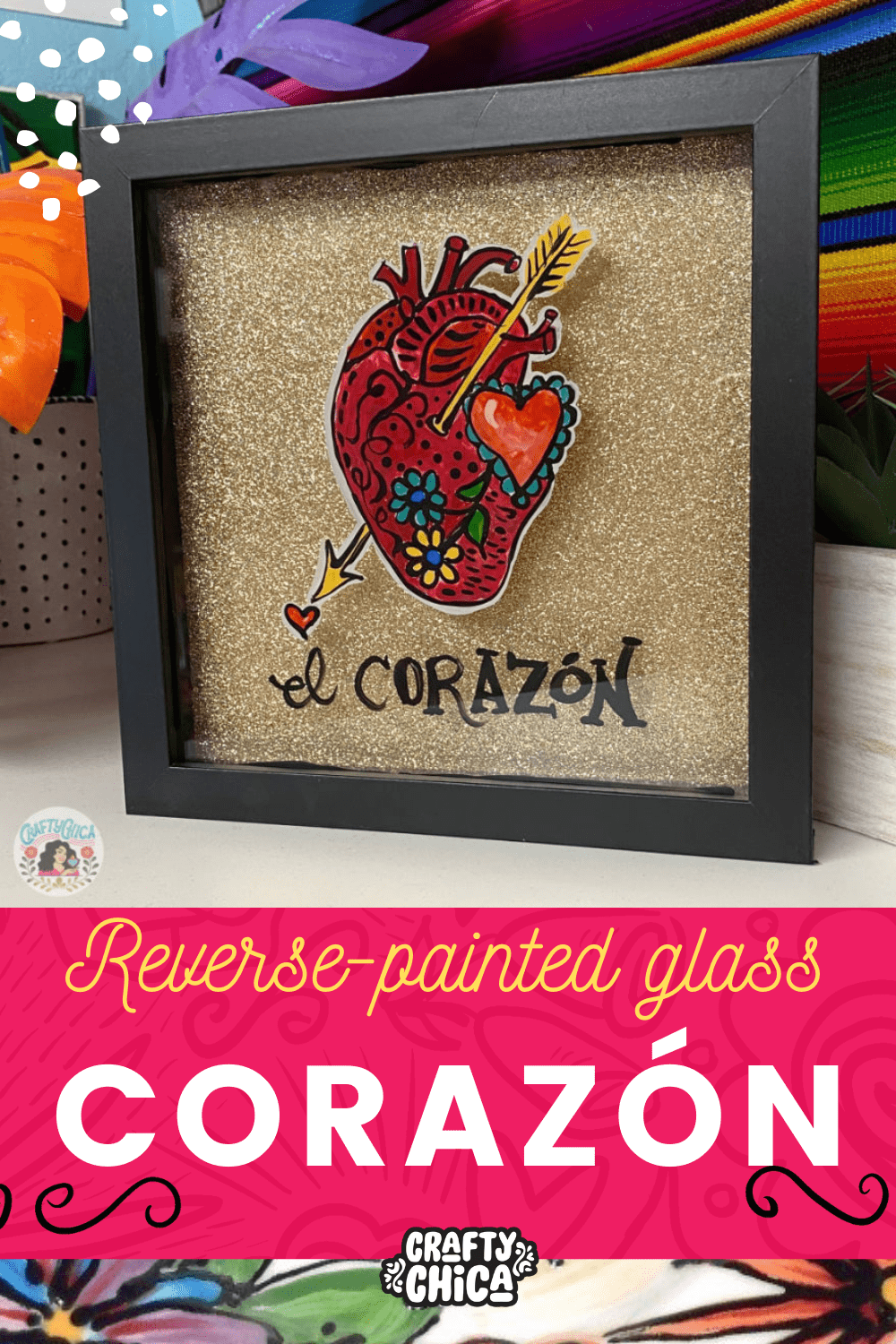 This project celebrates El Corazón (The Heart) – the key to all we do in life and love! I drew my own version of el corazón and made it the focal point of this piece. Reverse glass painting is a traditional art form that has renewed interest recently. And what really makes this project come together is that it is all contained within a shadowbox, which offers depth and beauty. Just like life!