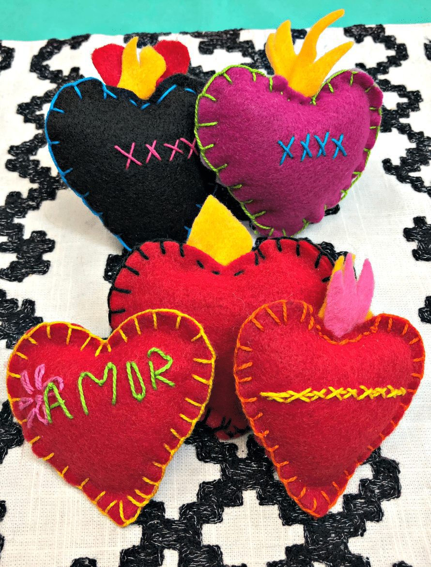 This is the perfect time to make stitched felt hearts for Valentine’s Day! Aren’t these so pretty? Our art collective, The Phoenix Fridas, made these colorful felt corazon pins as part of our demo booth at Creativation. People loved them! Debra Quartermain from Kunin Felt was kind enough to sponsor a day of our supplies and loaded us up with all these gorgeous colors!