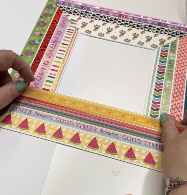 Turn your mat around and complete the next side in the same way. Continue until all four sides are covered with different stripes of the washi tape.